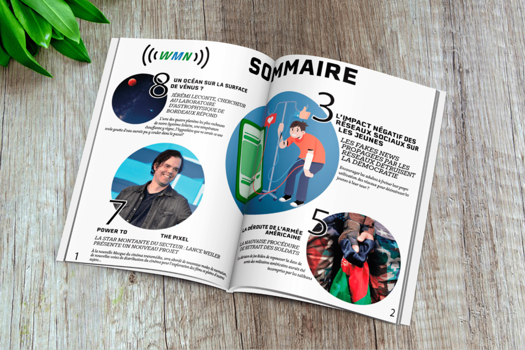 Nous devions créer la couverture et le sommaire d'un nouveau magazine fictif mettant en page 3 sujets imposés (actualité, culture, géopolitique) et 1 sujet de notre choix. Pour cela, j'ai utilisé des éléments graphiques circulaires afin de cherché à capturer l'essence du magazine et à attirer l'attention des lecteurs dès le premier regard. Ce projet m'a permis de mettre en valeur mes compétences en design graphique, en direction artistique et en mise en page.